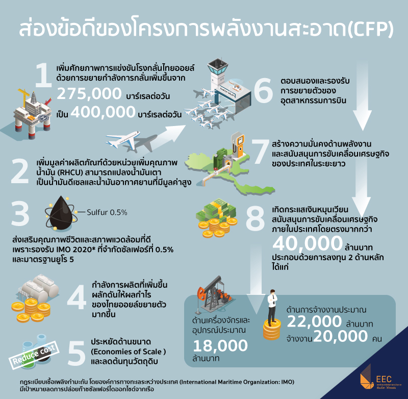 เนื่องจากโครงการ CFP จัดเป็นโครงการลงทุนขนาดใหญ่ของภาคเอกชนโครงการแรกภายในพื้นที่ EEC จึงสร้างโอกาสให้ประเทศไทยก้าวสู่การเป็นศูนย์กลางด้านพลังงานของภูมิภาคเอเชียตะวันออกเฉียงใต้โดยโครงการ CFP จัดเป็นโครงการภาคเอกชนที่มีเม็ดเงินลงทุนสูงสุดโครงการหนึ่งของประเทศ ก่อให้เกิดกระแสเงินหมุนเวียนสนับสนุนการขับเคลื่อนเศรษฐกิจภายในประเทศโดยตรงมากกว่า 40,000 ล้านบาท ประกอบด้วยวงเงินในการจ้างงานประมาณ 22,000 ล้านบาท เกิดการจ้างงาน 20,000 คนในช่วงระหว่างดำเนินการก่อสร้าง นอกจากนี้ยังมีวงเงินในการลงทุนด้านเครื่องจักรและอุปกรณ์ประมาณ 18,000 ล้านบาท อีกด้วย