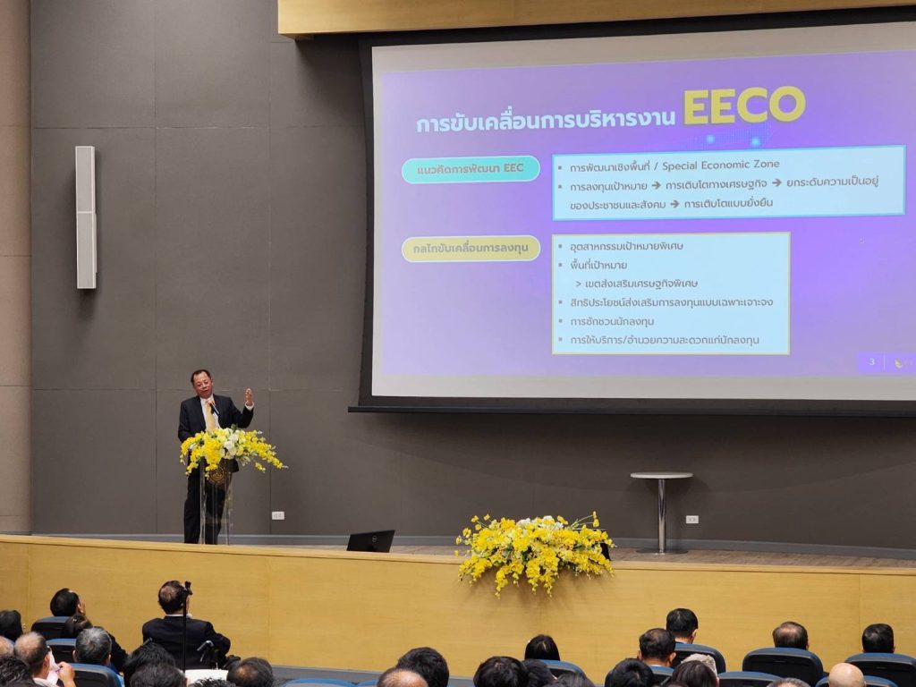 สำนักงานคณะกรรมการนโยบายเขตพัฒนาพิเศษภาคตะวันออก (สกพอ.) หรืออีอีซี ร่วมกับ มูลนิธิเสนาะ อูนากูล มหาวิทยาลัยบูรพา สถาบันวิจัยเพื่อการพัฒนาประเทศไทย (TDRI) สำนักงานพัฒนาเทคโนโลยีอวกาศและภูมิสารสนเทศ (องค์การมหาชน) (GISTDA) และศูนย์ศึกษาการพัฒนาที่ยั่งยืนและเศรษฐกิจพอเพียง สถาบันบัณฑิตพัฒนบริหารศาสตร์ (NIDA) จัดงานสัมมนาวิชาการประจำปี เรื่อง สถานการณ์ภาคตะวันออก พ.ศ. 2567 หัวข้อ “ระบบนิเวศของภาคตะวันออก และการบริหาร จัดการน้ำ” ณ หอประชุมธํารงบัวศรี มหาวิทยาลัยบูรพา โดยมี ดร. ณรงค์ชัย อัครเศรณี ประธานมูลนิธิเสนาะ อูนากูล เป็นประธาน ดร.จุฬา สุขมานพ เลขาธิการ อีอีซี ร่วมปาฐกถาพิเศษ ดร.วัชรินทร์ กาสลัก อธิการบดีมหาวิทยาลัยบูรพา กล่าวให้การต้อนรับ พร้อมด้วยผู้เข้าร่วมเสวนา และนำเสนอกรณีศึกษาจากหน่วยงานที่เกี่ยวข้อง อาทิ ดร.ปรียานุช ธรรมปิยา กรรมการมูลนิธิเสนาะ อูนากูล ดร.นิพนธ์ พัวพงศกร นักวิชาการ TDRI ดร.ดิชพงษ์ ภูมิเกียรติศักดิ์ หัวหน้าฝ่ายพัฒนาระบบนวัตกรรม GISTDA นายสมชาย หวังวัฒนาพาณิช ประธานสถาบันน้ำและสิ่งแวดล้อมเพื่อความยั่งยืน ส.อ.ท. เป็นต้น และมีดร.สมเกียรติ ตั้งกิจวานิชย์ ประธาน TDRI ร่วมดำเนินการเสวนา