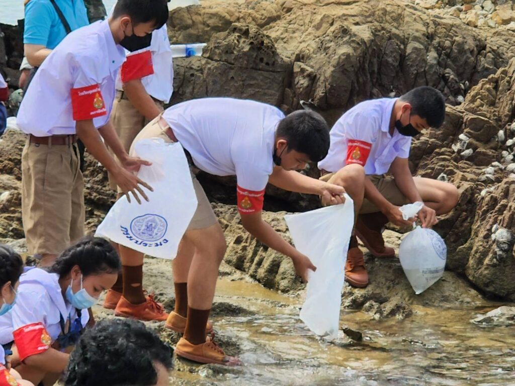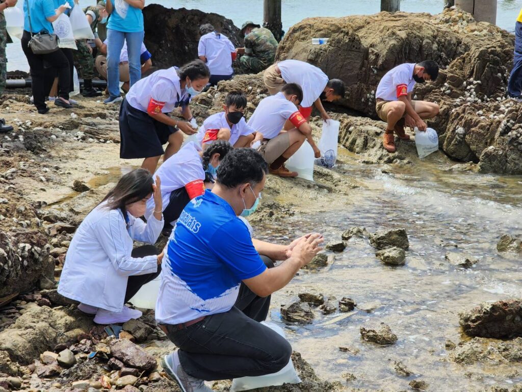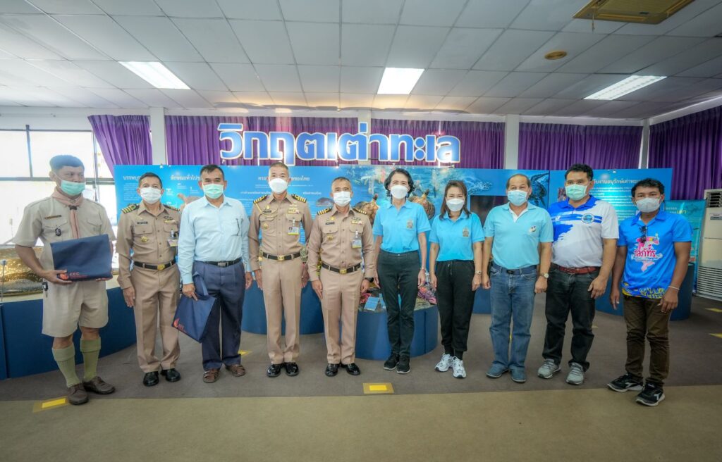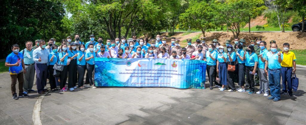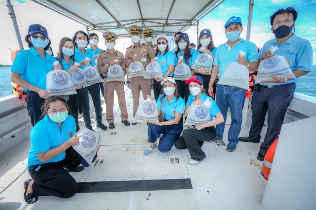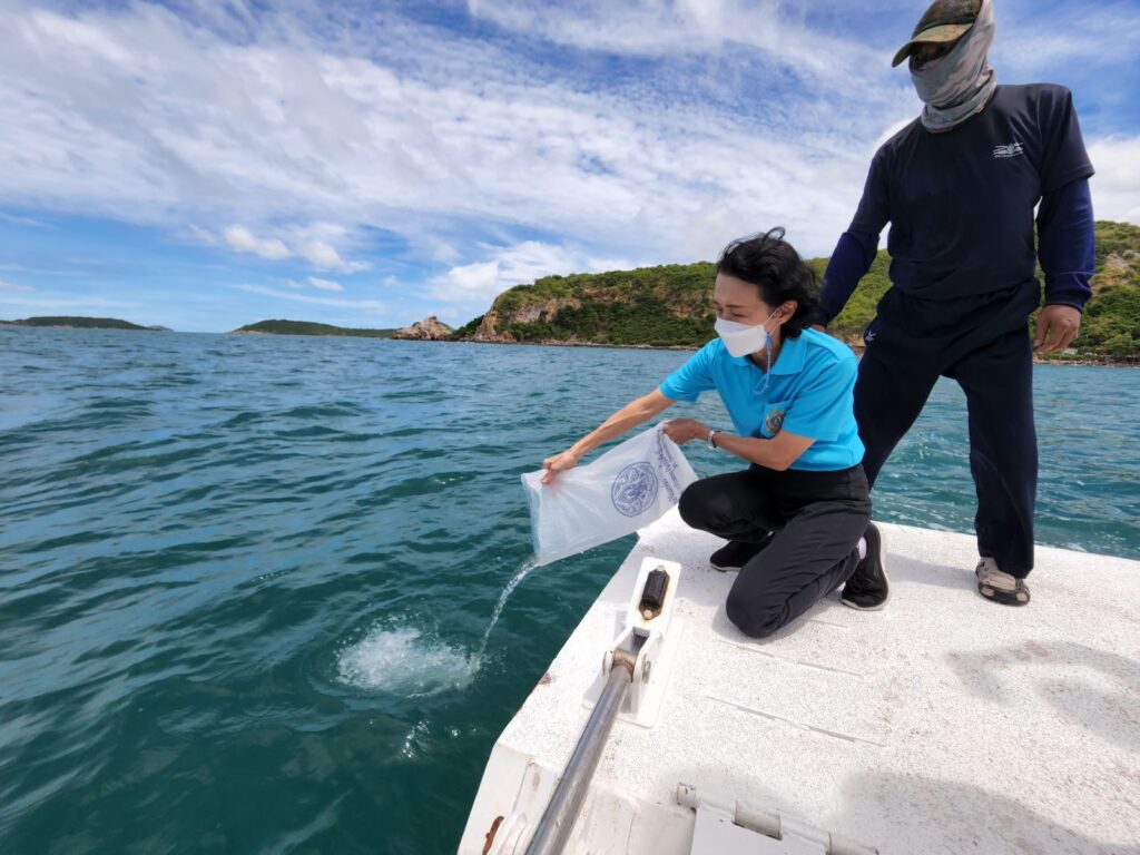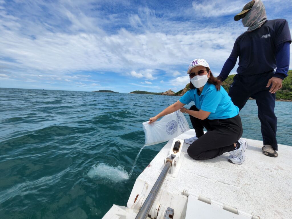 พร้อมกันนี้ คณะฯ ได้ร่วมกันปล่อยสัตว์ทะเล อาทิ กุ้งขาว มากกว่า 100,000 ตัว ปลากะพง จำนวน 4,000 ตัว บริเวณอ่าวเขาหมาจอ พิพิธภัณฑ์ธรรมชาติวิทยาเกาะและทะเลไทย ต.แสมสาร จ.ชลบุรี เพื่อถวายเป็นพระราชกุศลและฟื้นฟูเพิ่มผลผลิตทรัพยากรสัตว์น้ำและสร้างระบบนิเวศวิทยาให้มีความอุดมสมบูรณ์ ประชาชนในพื้นที่ได้ใช้ประโยชน์จากทรัพยากรสัตว์น้ำ เกิดการสร้างรายได้ ส่งเสริมให้ทุกภาคส่วนเกิดความตระหนักถึงความสำคัญในการดูแล รักษา อนุรักษ์ทรัพยากรธรรมชาติและสิ่งแวดล้อม นอกจากนี้ ได้เดินทางไปอุทยานใต้ทะเลเกาะขาม อ.สัตหีบ จ.ชลบุรี เข้าเยี่ยมชมและร่วมกิจกรรมเรียนรู้การอนุรักษ์และพัฒนาสภาพแวดล้อมทางทะเล พื้นที่ปะการังรอบเกาะขาม รวมถึงสร้างความร่วมมือกันดูแลรักษาทรัพยากรธรรมชาติและ สิ่งแวดล้อม ให้มีความยั่งยืนและเกิดประโยชน์สูงสุดต่อไป