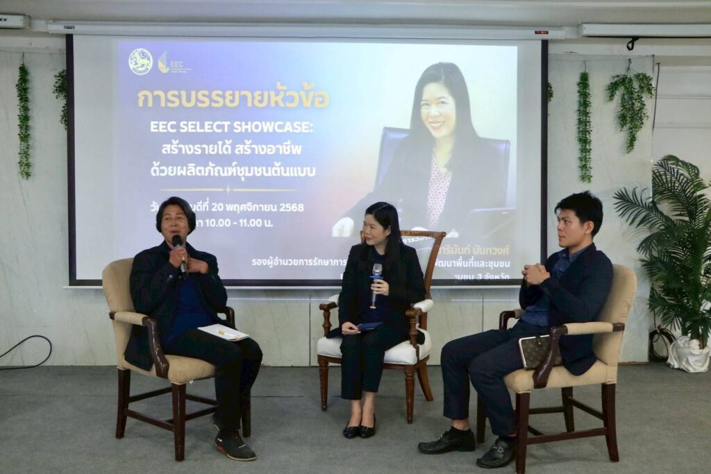 จากนั้น ได้มีจัดการเสวนาความสำเร็จจากโครงการ EEC SELECT และการยกระดับรายได้ ในหัวข้อ การสร้างรายได้และการสร้างอาชีพ ด้วยผลิตภัณฑ์ชุมชนต้นแบบ โดย ดร.ดารินันท์ นันทวงค์ รองผู้อำนวยการ รักษาการผู้อำนวยการสำนักพัฒนาพื้นที่และชุมชน สกพอ. ร่วมกับกลุ่มวิสาหกิจต้นแบบวสช.ท่องเที่ยวพัทยาก็มีนา โดย คุณชนาธิป บุญกลิ่น และห้างหุ้นส่วนจำกัด DEYA Massage โดยคุณจิรายุ ศิริลักษณ์ ที่ได้รับการรับรอง EEC Select 2025 ซึ่งทำให้ผู้เข้าอบรมเกิดความเข้าใจในแนวทางการพัฒนาอย่างเป็นรูปธรรมที่ทำให้ชุมชนได้รับประโยชน์จากโครงการฯที่สกพอ.ดำเนินการ