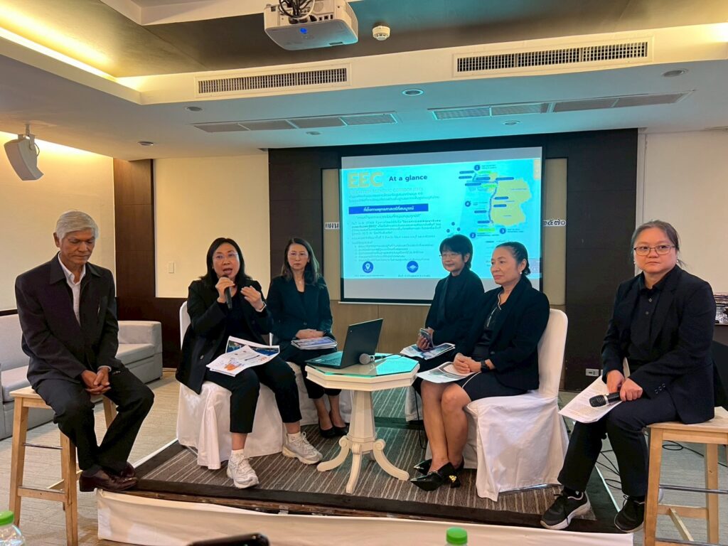 ในการอภิปรายหัวข้อ “ขับเคลื่อนแผนสิ่งแวดล้อมฯ อย่างยั่งยืน : เพื่อ EEC อนาคตสีเขียว” ได้มีการนำเสนอทิศทางการพัฒนาอีอีซี ตามศักยภาพของ 3 จังหวัด พร้อมทั้งแผนภาพรวมเพื่อพัฒนาอีอีซีระยะ 5 ปี (พ.ศ. 2571–2575) ที่มุ่งยกระดับการจัดการสิ่งแวดล้อมอย่างเป็นระบบผ่านการกำหนดกลยุทธ์และตัวชี้วัดที่ชัดเจน โดยให้ความสำคัญกับการจัดการทรัพยากรน้ำและการจัดการขยะเป็นประเด็นหลัก นอกจากนี้ ยังได้กล่าวถึงการดำเนินงานร่วมกับหน่วยงานภาครัฐและภาคเอกชนในการแก้ไขปัญหาน้ำเสียและการจัดการของเสีย โดยผลักดันการลงทุนในระบบบำบัดน้ำเสีย การจัดการขยะ และการผลิตพลังงานไฟฟ้าจากขยะ รวมถึงความร่วมมือกับธนาคารโลกในการพัฒนาเครื่องมือเพื่อใช้เป็นแหล่งอ้างอิงด้านการบริหารจัดการน้ำสำหรับหน่วยงานที่เกี่ยวข้อง ตลอดจนการทำงานร่วมกับสำนักงานทรัพยากรน้ำแห่งชาติ (สทนช.) เพื่อเพิ่มประสิทธิภาพการบริหารจัดการทรัพยากรน้ำในพื้นที่อีอีซีให้สอดคล้องกับความต้องการใช้น้ำของทุกภาคส่วน สำหรับทิศทางในอนาคต อีอีซีอยู่ระหว่างการพัฒนาเมืองใหม่ที่ใช้พลังงานสะอาดและมุ่งสู่เป้าหมาย Net Zero เพื่อสนับสนุนการพัฒนาอย่างยั่งยืนในระยะยาว