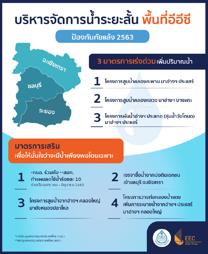 มาตรการสำคัญระยะสั้น รองรับวิกฤตภัยแล้ง ปี 2563 จากการทำงานร่วมกันอย่างใกล้ชิดของ สทนช. สกพอ. กรมชลประทาน คณะกรรมการลุ่มน้ำชายฝั่งทะเลตะวันออก สภาอุตสาหกรรมแห่งประเทศไทย (สอท.) บริษัท East Water และภาคเอกชน ทั้งภาคเกษตร อุตสาหกรรม และบริการ มีโครงการเพิ่มปริมาณน้ำ ดังนี้